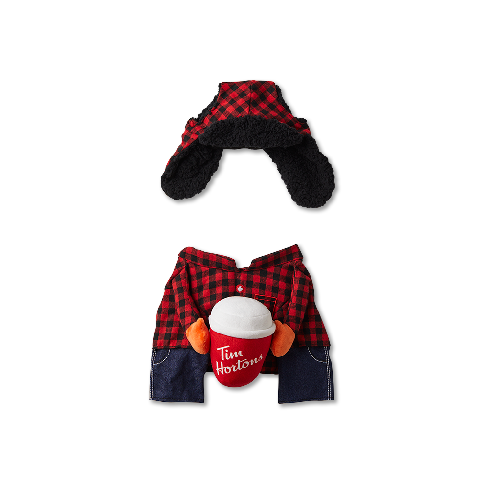 Celebrate Halloween with the Lumberjack Pet Costume! Featuring a classic checkered pattern. embroidered maple leaf. denim-look accents. and complete with the iconic Tims Red Hot Cup so that your furry friends can join in on the Halloween spirit. Costume includes a trapper hat with chin strap. holes for ears. and a body piece with arm holes. See size guide for fit details.